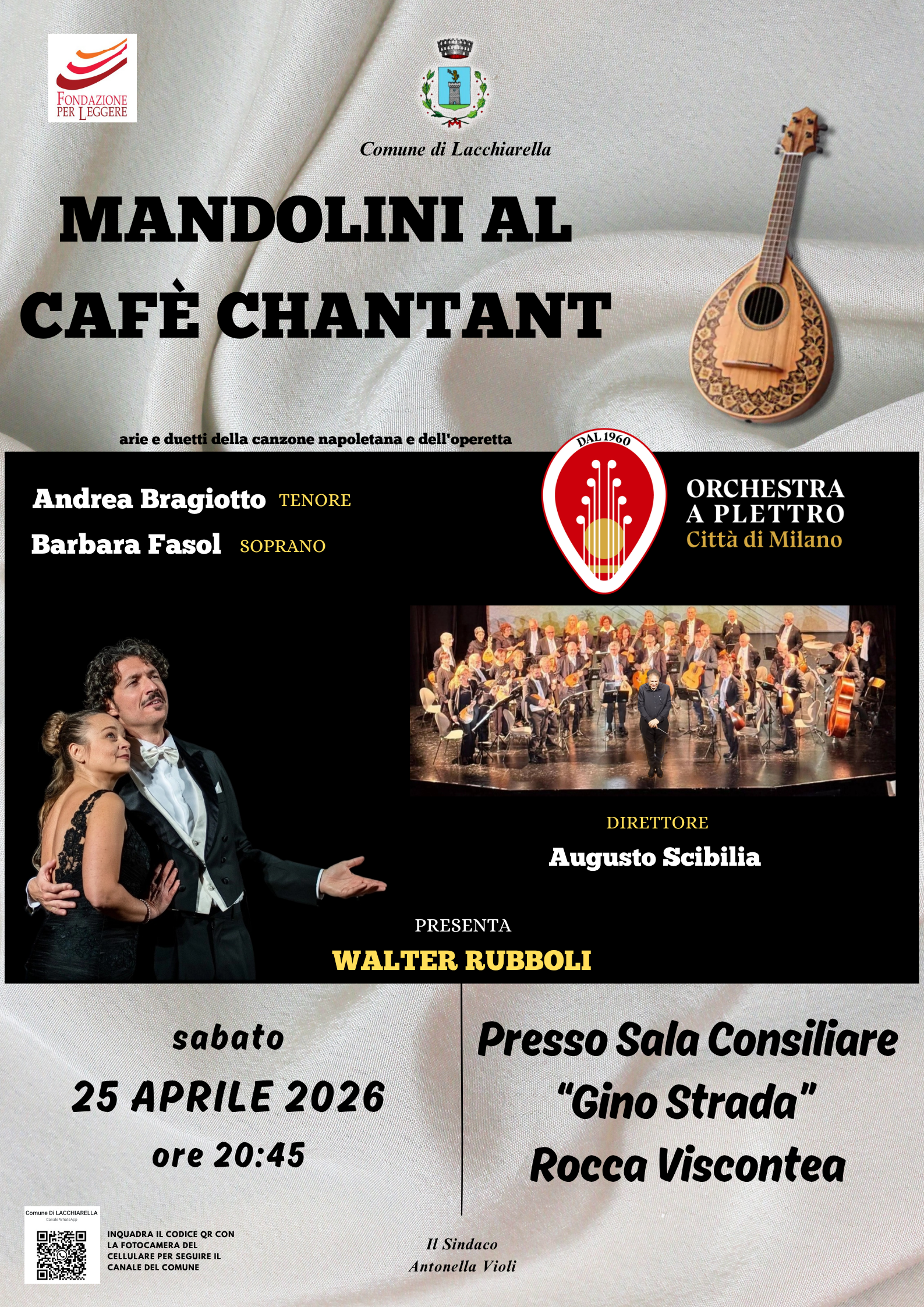 Il concerto propone arie della canzone napoletana e operette. Interpreti Barbara Fasol e Andrea Bragiotto. Il concerto è accompagnato dall'Orchestra a plettro Città di Milano, storica formazione musicale costituita solamente da una trentina di mandolini, mandole, mandoloncelli e chitarre. Presenta Walter Rubboli. Da non perdere.